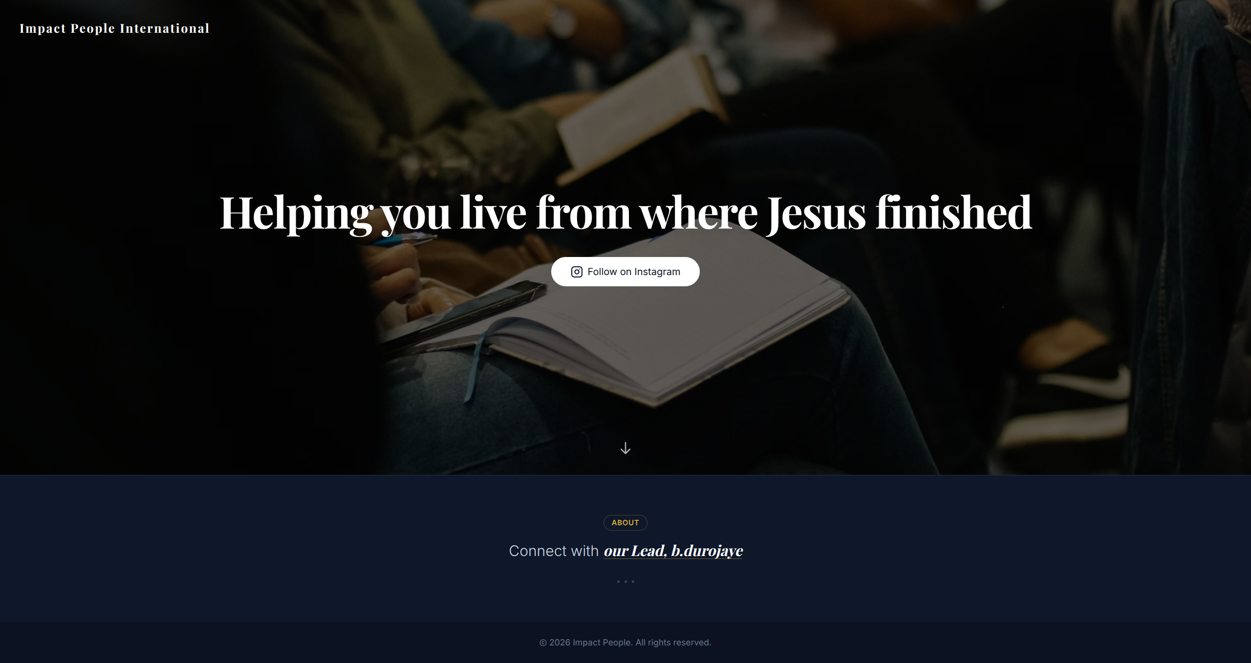 A focused ministry landing page for a Lagos-based non-profit. Full-bleed photography, Instagram integration, and a single clear call to action. Built for community outreach and spiritual engagement.
