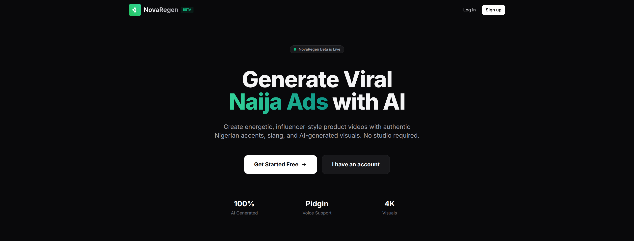 An AI video ad generator built for the Nigerian market. Creates influencer-style product videos with authentic Pidgin voice support, Nigerian slang, and AI-generated 4K visuals. No studio required.